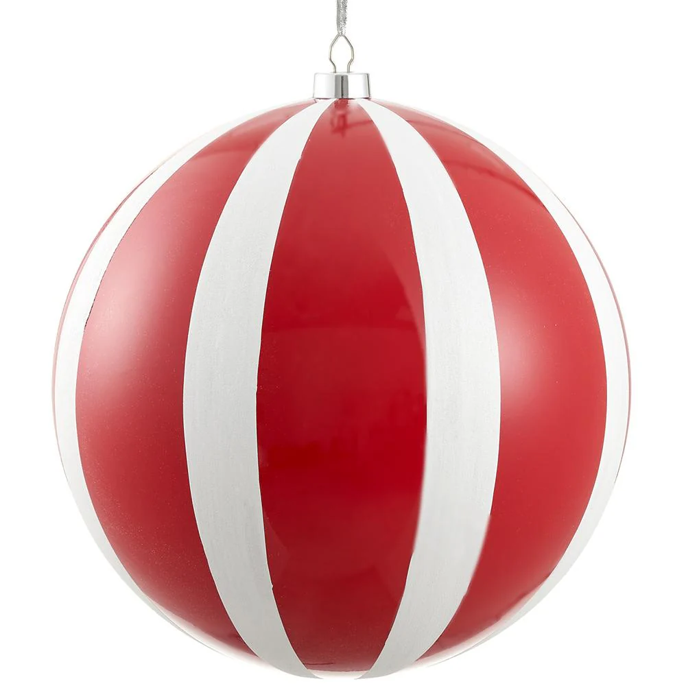 ESFERA DE PLASTICO ROJA CON FRANJAS BLANCAS BRILLANTES GRANDE