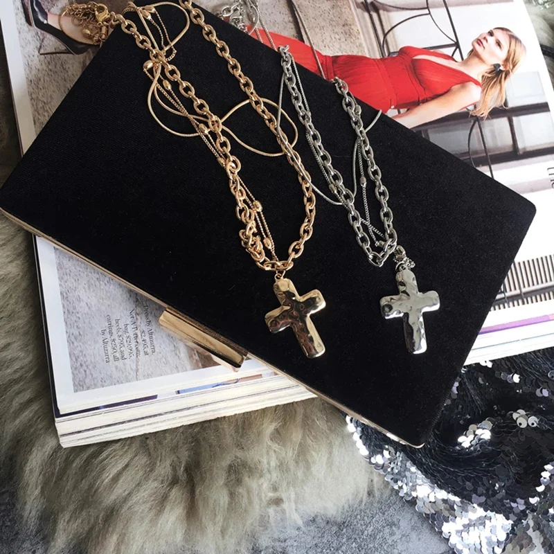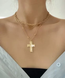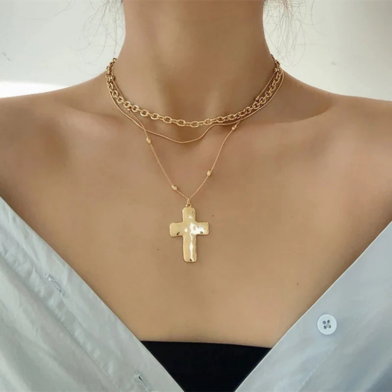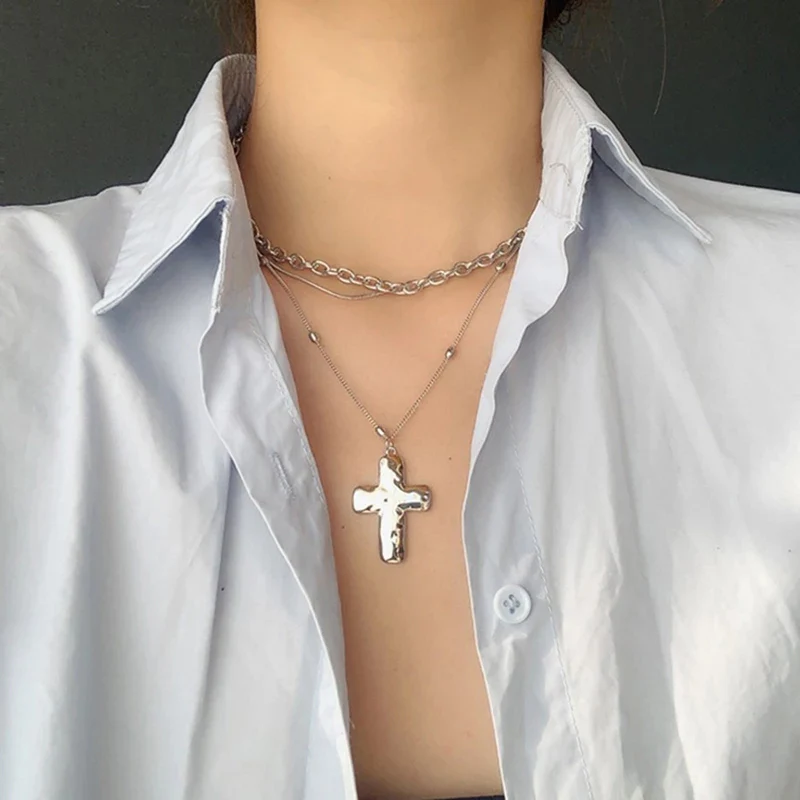 Collar fabricado en aleacion de metales con diseño tipo layer de tres niveles con grande cruz central. Cuidado y limpieza: Evita materiales abrasivos y limpia únicamente con telas suaves, mantener almacenado libre de agua, sudor y cualquier tipo de cosmetico y de preferencia separado para evitar ser maltratado por otro artículo.